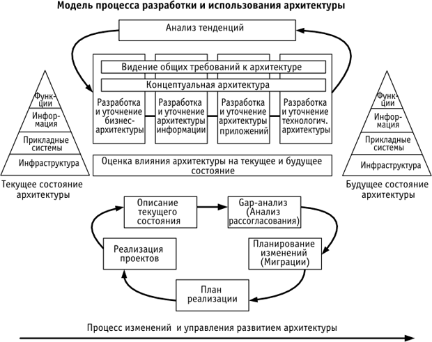 Очевидным логическим шагом для эффективного описания существующих в организации процессов и планируемых изменений явилось, по мнению авторов, введение понятия архитектуры предприятия (Enterprise Architecture), которая объединяет корпоративную ИТ-архитектуру масштаба предприятия c бизнес-архитектурой и позволяет обеспечить достижение стратегических целей предприятия. В реальности это две стороны одной медали, которые связаны неразрывно. По сути дела, это должна быть одна архитектура предприятия, показывающая, как связаны друг с другом все элементы ведения бизнеса, что включает также все элементы, связанные с информационными технологиями. Заметим, что в данном контексте мы не различаем деятельность коммерческих и государственных организаций. Действительно, для описания деятельности и функций государственных организаций за рубежом очень часто используется термин "бизнес государственных организаций", что пока не принято в условиях российской действительности.