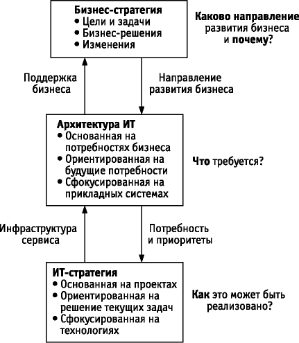 Архитектура ИТ и архитектура предприятия в целом как раз и является основным механизмом интерпретации и реализации целей организации через адекватные ИТ-инфраструктуру и системы. Это достигается через создание определенного количества взаимосвязанных архитектурных представлений (далее они будут называться доменами архитектуры). Имеется множество методик описания архитектуры (см. подробнее далее), и все они таким или иным образом разбивают ее на различное количество моделей и определений, которые относятся к таким областям, как бизнес, информация (данные), прикладные системы, технологическая инфраструктура.