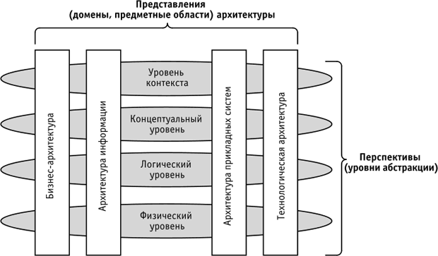 Количество и позиционирование уровней абстракции в анализе предметных областей также не являются жестко заданными, и в этом плане существуют различные рекомендации. Очень часто можно встретить следующие уровни абстракции или перспективы в анализе архитектурных областей: