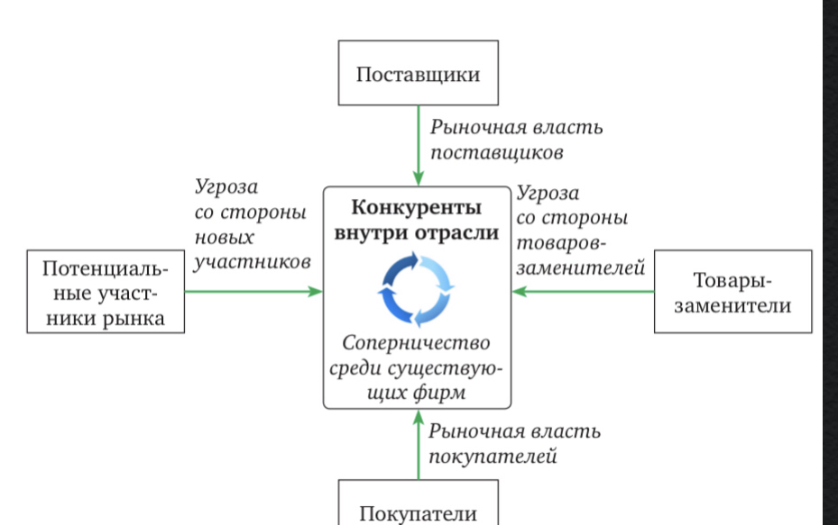 Анализ микросреды может делаться с помощью анализа пяти сил Пор- тера (Porter five forces analysis) — методики для анализа отраслей и выра- ботки стратегии бизнеса, разработанной Майклом Портером в Гарвард- ской школе бизнеса в 1979 г. Пять сил Портера включают: