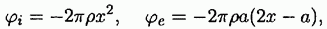 Задача 11. Бесконечная плоская пластина толщиной 2а равномерно заряжена электричеством с объемной плотностью Ось х перпендикулярна пластине, начало координат расположено в срединной плоскости, равноотстоящей от обеих поверхностей пластины. Показать, что потенциал поля внутри и вне пластины равен соответственно: