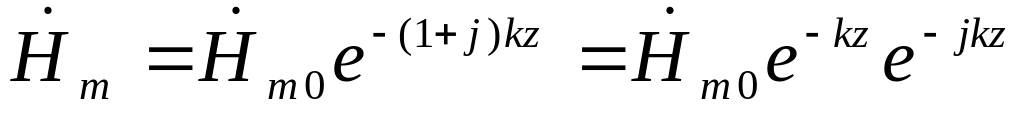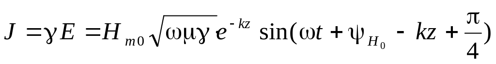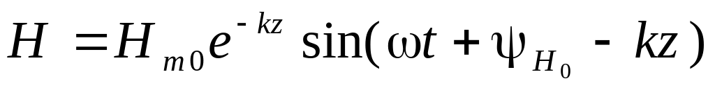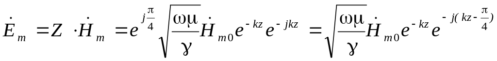 Волна напряженности магнитного поля отстает по фазе от волны напряженности электрического поля на 45 градусов. Амплитуды обеих волн по мере продвижения вдоль оси z вглубь проводника затухают со скоростью, определяемой множителем e-kz.
