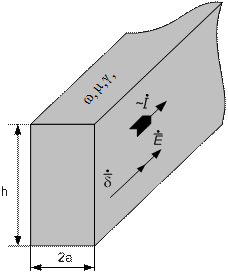 Электрический поверхностный эффект на примере шины прямоугольного сечения. Внутри шины существуют электромагнитное поле и ток проводимости. За пределами шины (удельная проводимость γ=0) ток проводимости (δ=0) отсутствует, но электрическое и магнитное поля существуют.