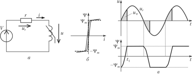 Рис. 7.4. Схема катушки (а), характеристика индуктивности (б), кривые напряжения и тока (в)