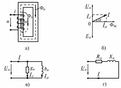 Схема замещения и векторная диаграмма катушки с ферромагнитным магнитопроводом