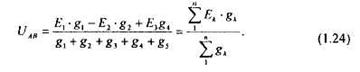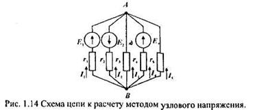 Метод узлового напряжения. Рассматриваемый метод расчета целесообразно применять к схеме (рис. 1.14), имеющей несколько параллельных ветвей, сходящихся в двух узловых точках, а также к, электрическим цепям, которые в результате несложных преображений могут быть приведены к схеме с двумя узлами.