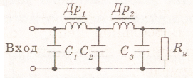 Наиболее распространенными сглаживающими фильтрами в выпрямителях электронных приборов являются П-образные LC-фильтры (рис. 12.12, а). В них постоянная составляющая выпрямленного тока, свободно проходящая через дроссель Др. , попадает затем в нагрузку и замыкается через трансформатор. Переменные составляющие, замыкаясь через большие емкости С1 и С2 , в нагрузку не проходят.