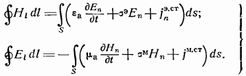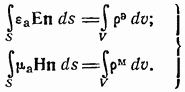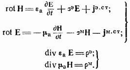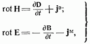 В уравнения (1-1), (1-2) и (1-3) совершенно формально введены, помимо электрических токов и зарядов, также магнитные токи и заряды. В действительности магнитных токов и магнитных зарядов в природе не существует, поэтому в написанных уравнениях нужно было бы положить Однако введение этих величин в уравнения электродинамики оказывается удобным во многих случаях, например, при определении излучения щелевых антенн.