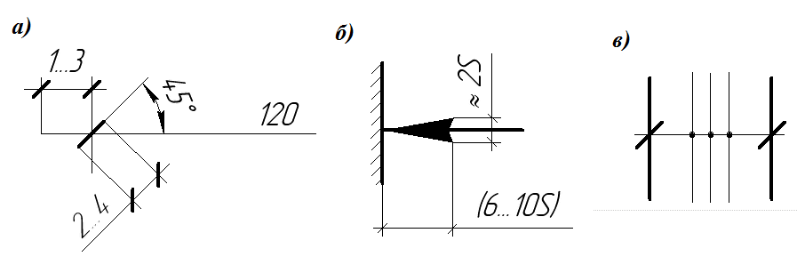 Размеры в миллиметрах на строительных чертежах, как правило, наносят в виде замкнутой цепочки без указания единицы измерения. Если размеры проставляют в других единицах, это оговаривают в примечании к чертежам. Размерные линии на строительных чертежах ограничивают засечками – короткими штрихами длиной 2-4 мм, проводимыми с наклоном вправо под углом 45° к размерной линии. Толщина линии засечки равна толщине сплошной основной линии, принятой на данном чертеже. Размерные линии должны выступать за крайние выносные линии на 1-3 мм. Размерное число располагают над размерной линией примерно на расстоянии от 0,5 до 1 мм (рис. 110а, 110б). Выносная линия должна выступать за размерную на 1-5 мм. При недостатке места для засечек на размерных линиях, представляющих собой замкнутую цепочку, засечки допускается заменять точками (рис. 110в).