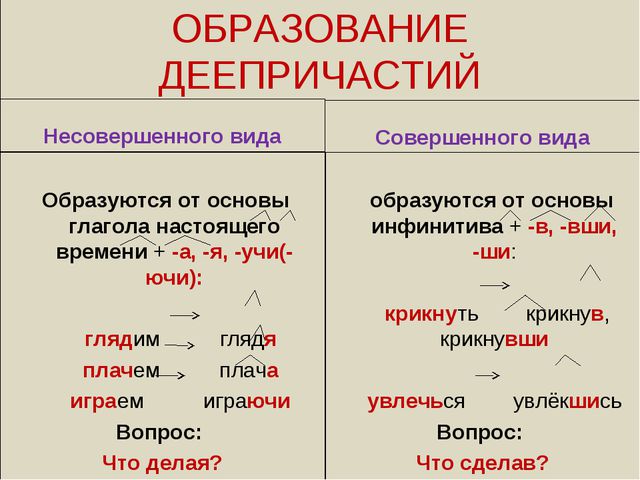 Деепричастия несовершенного вида образуются от основы глагола настоящего времени при помощи суффикса –а (-я): моргают – моргая, ворчат – ворча.