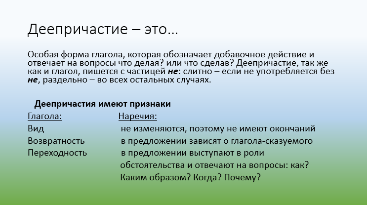Деепричастие – это неизменяемая глагольная форма, обозначающая добавочное действие и совмещающая в себе признаки глагола и наречия.