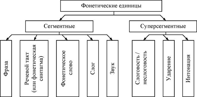 Наша речь представляет собой поток звучаний, цепь последовательно произносимых отрезков. Но поток звучаний не является сплошным, как, например, сигнал автомобиля. В речи есть паузы разной длительности, которые разделяют звуковой поток на отрезки линейно следующие один за другим. Разные отрезки речевого потока, располагающиеся в линейной последовательности, называются сегментными единицами (сегмент - отрезок речи, вычленяющийся из линейной последовательности (речевого потока)). К сегментным единицам относятся фраза, речевой такт (или фонетическая синтагма), фонетическое слово, слог, звук. Звук - наименьшая сегментная единица. Фраза - наибольшая сегментная единица. Каждая более крупная сегментная единица состоит из более мелких сегментных единиц: фраза из синтагм, синтагма из фонетических слов, фонетическое слово из слогов, слог из звуков. Сегментные единицы могут быть выделены из более крупных единиц и произнесены отдельно.