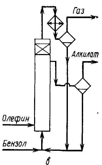 В нижнюю часть колонны подают сухой бензол и олефиновую фракцию, которая барботирует через жидкость, интенсивно ее перемешивая. Жидкая реакционная масса стекает через боковой перелив в сепаратор, где отстаивается более тяжелый каталитический комплекс, возвращаемый в низ алкилатора, а алкилат поступает на дальнейшую переработку
