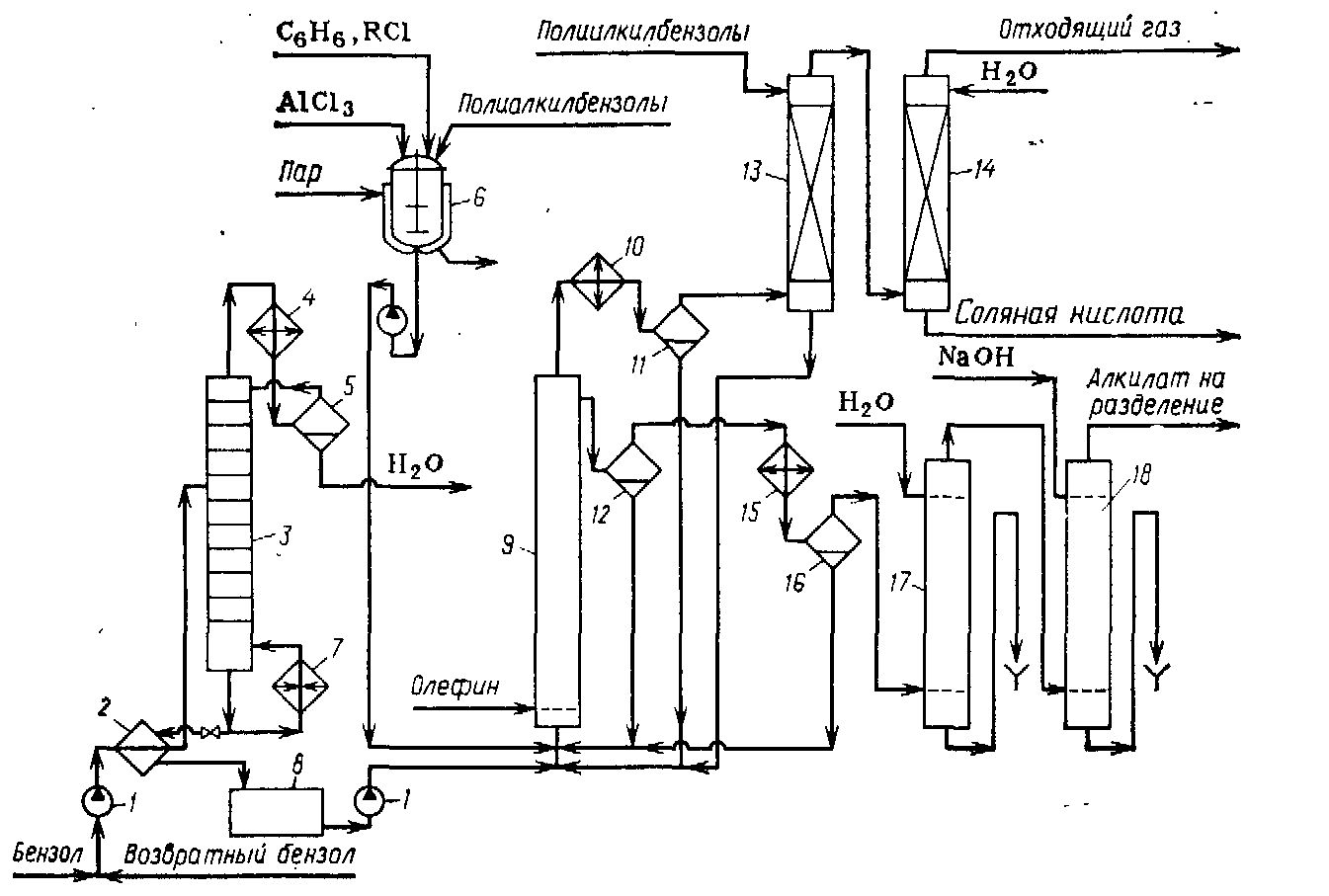 Газы, отходящие после конденсатора 10, содержат значительное количество легколетучего бензола. Для улавливания бензола эти газы направляют в абсорбер 13, который орошается полиалкилбензолами. Собирающийся в нижней части абсорбера раствор поступает в реакционный аппарат 9 для переалкилирования. Газы после абсорбера 13 промывают водой в скруббере 14 для удаления HCl и выводят. Углеводородный слой, отбираемый после сепаратора 12, проходит водяной холодильник 15 и дополнительно отстаивается в холодном сепараторе 16, откуда каталитический комплекс периодически возвращают в алкилатор. Алкилат направляют после этого на очистку. С этой целью смесь промывают в системе противоточных колонн 17 и 18 вначале водой, а затем водной щелочью. Нейтрализованная смесь углеводородов (алкилат) поступает на ректификацию
