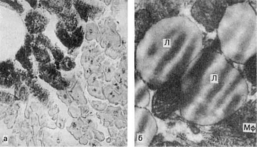 а - капли жира (на рисунке черного цвета) в цитоплазме мышечных волокон (микроско- пическая картина); б - включения липидов (Л), имеющие характерную исчерченность; Мф - миофибриллы. Электронограмма. х21 000