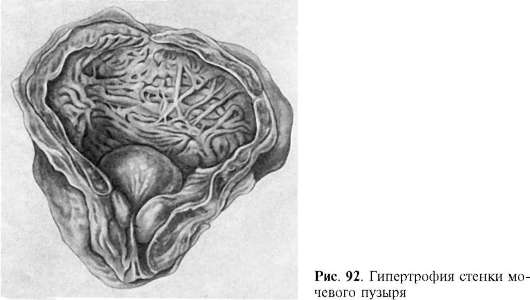 Гипертрофия стенки мочевого пузыря встречается при гиперплазии (аденоме) предстательной железы, суживающей мочеиспускательный канал , других затруднениях опорожнения пузыря. Стенка мочевого пузыря утолщается, со стороны слизистой оболочки видны мышечные трабекулы ( трабекулярная гипертрофия).