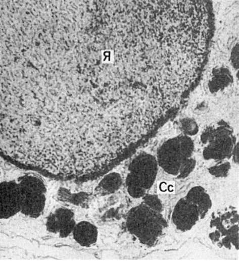 Сидеробласт. Крупное ядро (Я), узкий ободок цитоплазмы с большим числом сидеросом (Сс). Электронограмма. х20 000