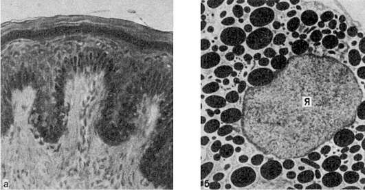 а - в базальном слое эпидермиса скопления меланоцитов; в дерме много меланофагов; б - меланоцит кожи. В цитоплазме много меланосом. Я - ядро. Электронограмма. х10 000