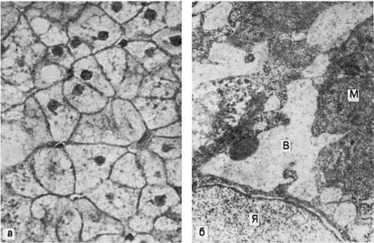 а - микроскопическая картина; вакуолизация гепатоцитов; б - электронограмма: рас- ширение канальцев эндоплазматической сети и образование вакуолей (В), заполненных хлопьевидным содержимым. Мембраны, ограничивающие вакуоли, почти полностью ли- шены рибосом. Вакуоли сдавливают расположенные между ними митохондрии (М), часть которых подвергается деструкции; Я - ядро гепатоцита. х18 000