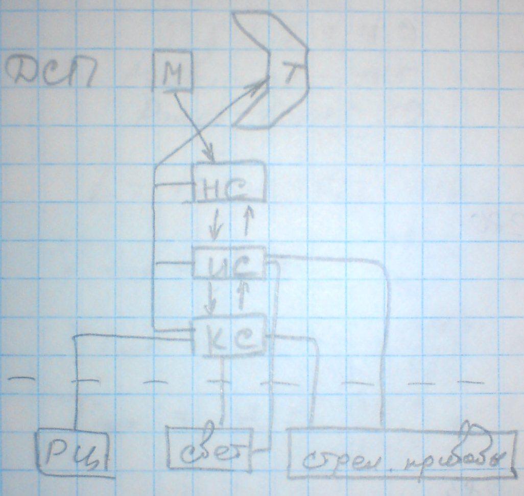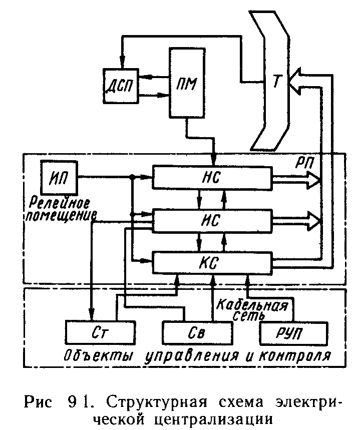 ДСП с помощью манипулятора ПМ выполняет дей-я, необходимые для задания маршрута, которые фиксируются наборными схемами НС в релейном помещении РП. Исполнительные схемы ИС управляют напольным оборудованием, стрелками и светофорами, при выполнении условия задания маршрута, для чего ИС связаны с Контрольными схемами КС. Инф-я о задании маршрута, состоянии напольн устр-в и положении ПС выдается ДСП на табло Т.