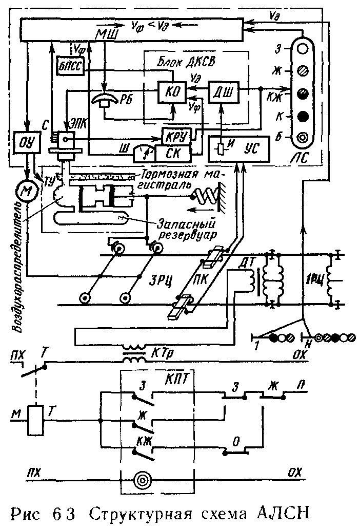 В зависимости от показаний путевого светофора(6.2), к которому приближается поезд Б, контролируются определенные скорости его движения. На З огонь установленная скорость Vу устр-ми АЛСН не ограничевается и бдительность машиниста непроверяется. Скорость проследования Ж и К огней ограничиваются скоростями Vж и Vкж. Скорость проследования К огня не должна превышать 20 км/ч.