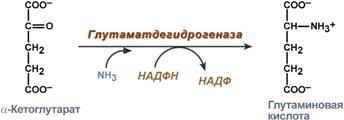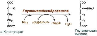 1.    синтез глутаминовой кислоты (восстановительное аминирование) – взаимодействие α-кетоглутарата с аммиаком.