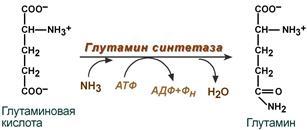 синтез глутамина – взаимодействие глутамата с аммиаком.