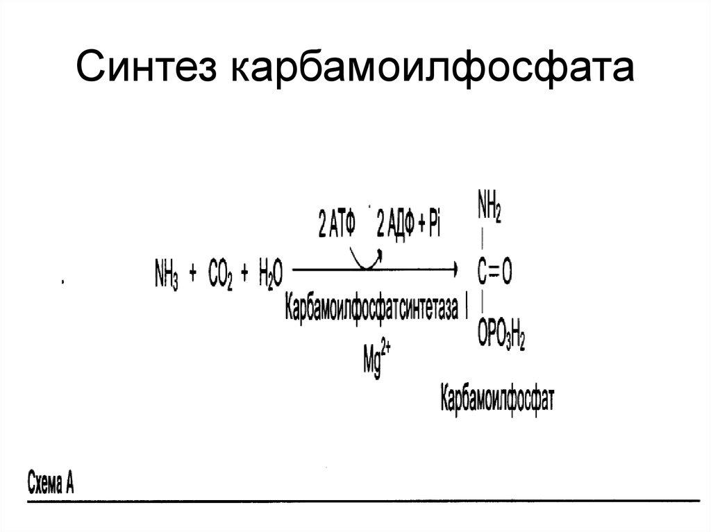 1. синтез карбамоилфосфата, происходит в митохондриях печени. Реакция является первой в процессе синтеза мочевины - молекулы, в составе которой аммиак удаляется из организма.
