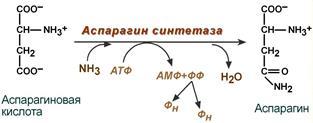 1. синтез аспарагина – взаимодействие аспартата с аммиаком. Является второстепенным способом уборки аммиака, энергетически невыгоден, т.к. при этом тратятся 2 макроэргические связи,