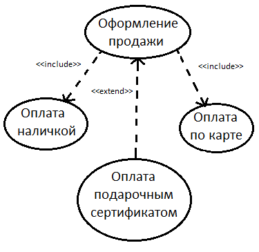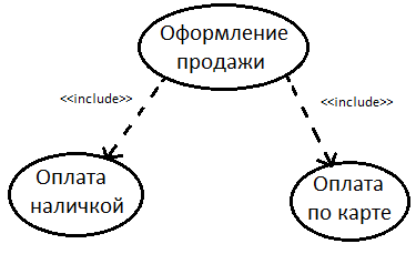 Позволяет одному прецеденту использовать функциональность другого. С помощью таких связей моделируется многократно применяемая функциональность, встречающаяся в двух и более прецедентах.
