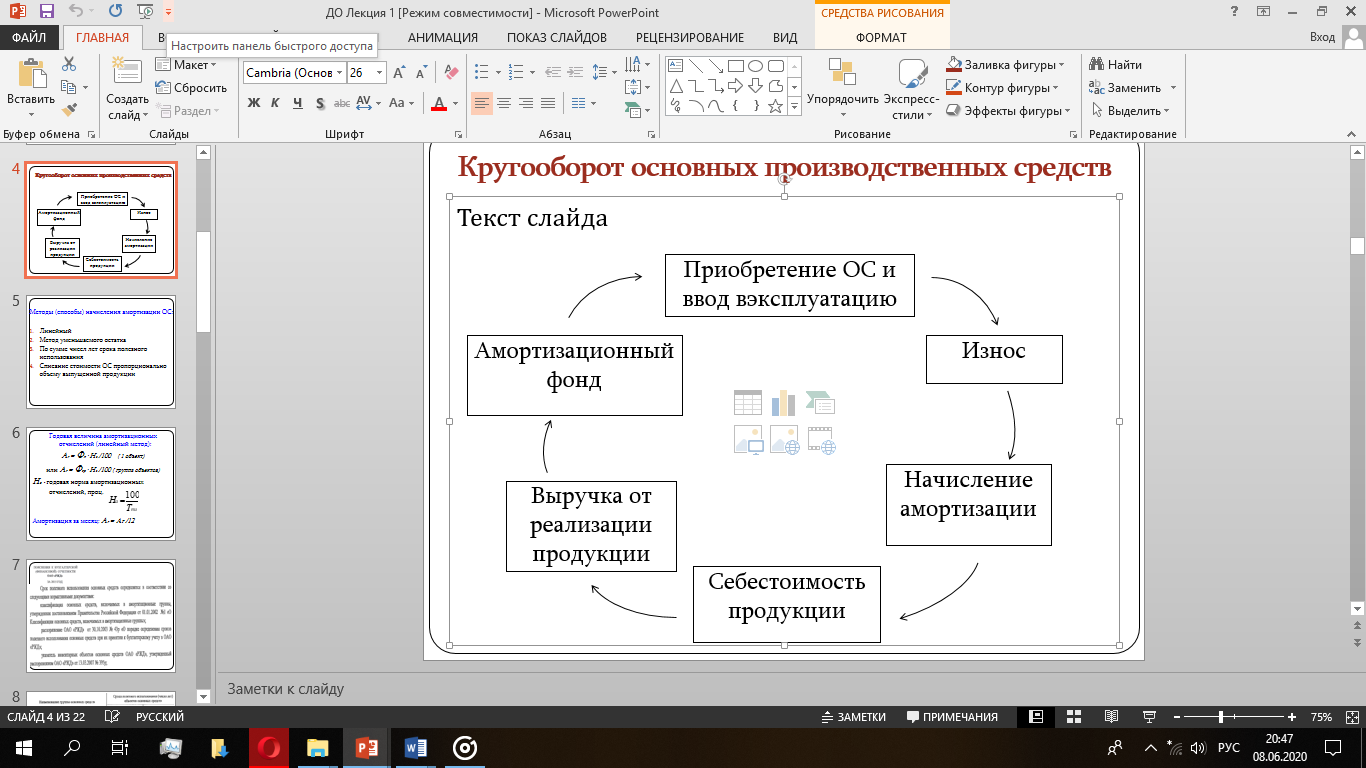 Моральный износ - это утрата стоимости вследствие снижения стоимости воспроизводства аналогичных объектов основных средств, обусловленных совершенствованием технологии и организации производственного процесса. Существует два вида морального износа:1-ый - основные средства обесцениваются, так как аналогичные основные средства производятся с меньшими затратами и становятся дешевле;2-ой - в результате научно-технического прогресса появляется более современное и более производительное оборудование.Амортизация - это процесс ежемесячного перенесения части первоначальной стоимости объекта основныхсредств на затраты производства (себестоимостьпродукции). Цель – накопление денежных средств(амортизационного фонда) для реновации (полной замены) изношенного объекта основныхсредств.