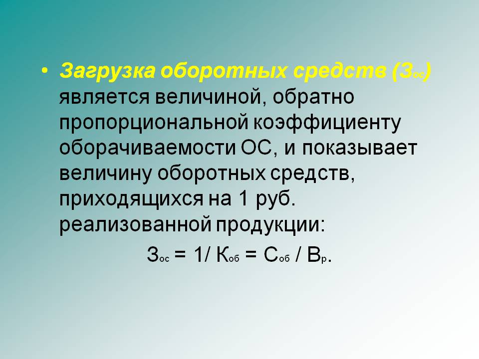 3- загрузка оборотных средств- величина, обратно пропорцион. коэфф. оборачиваемости ОС и показ-ет величину обор средств, приходящ-ся на 1 руб реализ продукции