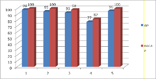 Итак, из рисунка можно увидеть, что отношение к урокам ИЗО и к самому предмету повысился, так как уроки мы проводили в интересной форме и детям давалось больше времени на практическую часть. Если только 98% учащимся нравился урок ИЗО, то сейчас 100% детей предпочитают урок ИЗО, если в начале 93 % учеников были знакомы со словом ДПИ, то сейчас этот коэффициент составляет 98% и.т.д.
