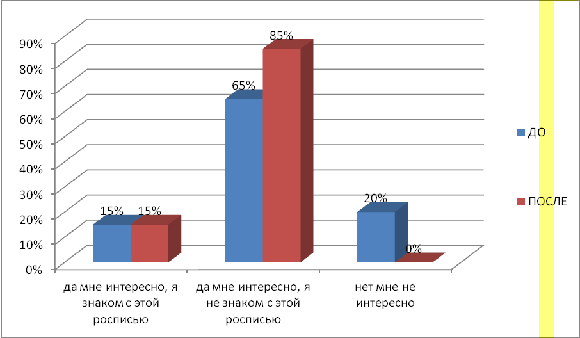 Итак, из рисунка можно увидеть, что заинтересованность повысилось, если в констатирующем эксперименте 20% учеников не были заинтересованы гжельской росписью, то сейчас коэффициент показывает 0%.