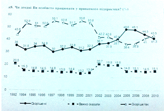 Протягом всього періоду на питання "Чи згодні ви особисто працювати у приватного підприємця?" від 36,4% до 55,6% респондентів відповідали позитивно, негативно - від 30% до 48,6%, відповідь "важко відповісти" - від 13,2% до 20,7%. В період з 1992 по 2001 роки лідирує по кількості голосів відповідь на питання "скоріше так" (від 43,8% до 53,8% голосів).З 2001 по 2003 рік відповіді "скоріше так" і "скоріше ні" мають приблизно однакову кількість голосів. Після 2004 року на перше місце виходить відповідь "скоріше ні" (від 40,4% до 48,6), в той час як кількість відповідей "скоріше так" зменшується (від 36,4% до 43,5%). Отже до 2001 року переважна кількість населення бажала працювати у приватного підприємця, після цього все більша і більша кількість опитаних висловлювали небажання працювати у приватного підприємця.
