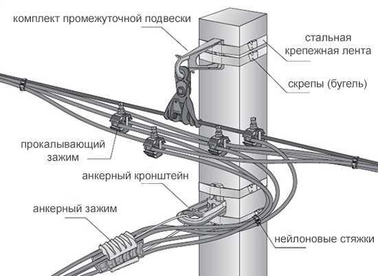 Для врізки дротів використовують проколюючи затискачі, що дозволяють зробити підключення без зачистки ізоляції кабелю. Потім підключають наконечники. Щоб підвісити дроти на довжині більше 25 метрів, між стовпами натягують трос. На стовпах фіксують тримачі для зручної і швидкої установки кабелю.
