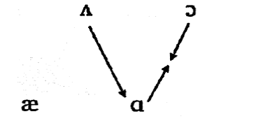 Фонетичний простір, в який рухається [ʌ] (та позиція, у котрій знаходився раніше звук [а]), охоплюється монофтонгізацією - [aw]. Щоб уникнути можливого злиття [aw] і [ʌ], монофтонгізірованний [aw] реалізується мовцем як [а:] [12, с. 223-240.]. Такий фонетичний процес об’єктивно запобігає контакту між голосними середнього ряду нижнього піднесення.