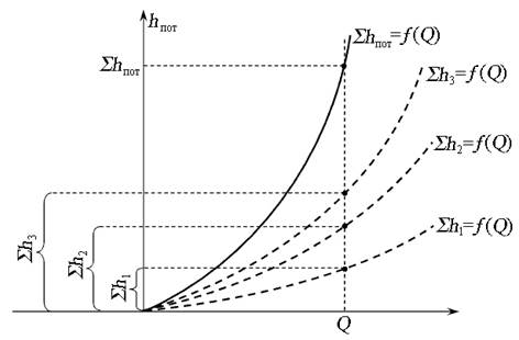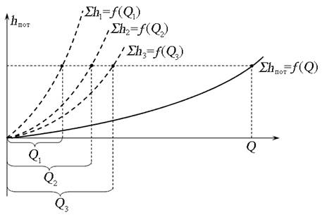 Для построения общей гидравлической характеристики сложного трубопровода в одной системе координат строят характеристики для каждого простого трубопровода. Так как потери напора в трубопроводах равны, а суммируются расходы, сложение производят по оси абсцисс (рис. 6.7).