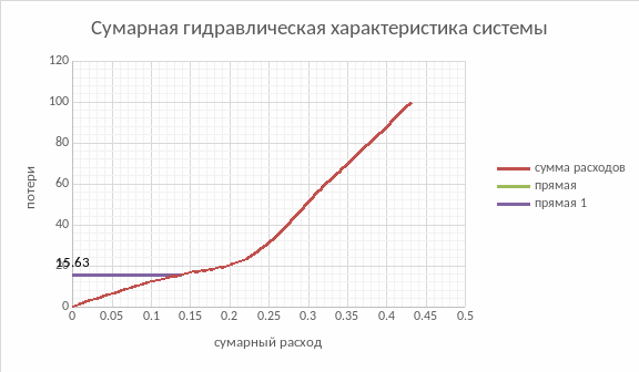 Проводим вертикальную прямую, соответствующую Q=0,139. Пересечение этой прямой с построенной зависимостью h=f(Q) соответствует потерям системы. Для более точного решения воспользуемся интерполяцией.