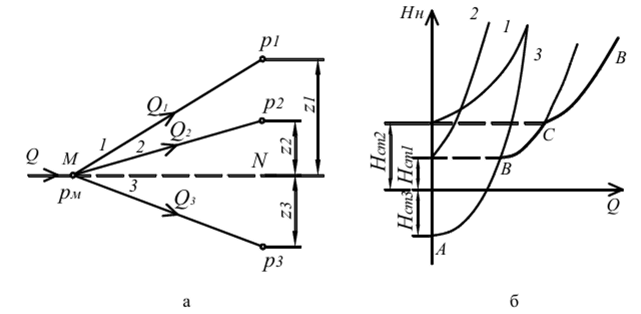 Пусть основной трубопровод имеет разветвление в сечении М-М, от которого отходят, например, три трубы 1, 2 и 3 разных диаметров, содержащие различные местные сопротивления (рис. 75, а). Геометрические высоты z1, z2 и z3 конечных сечений и давления P1, P2 и P3 в них будут также различны.