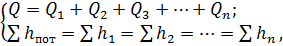 В таком трубопроводе расходы жидкости Q1, Q2, Q3 … Qn распределяются таким образом, что гидравлические потери во всех параллельных линиях одинаковы: