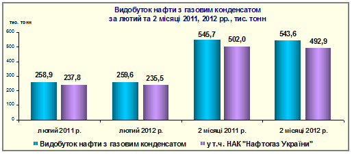 У лютому 2012 року в Україні видобуто нафти з газовим конденсатом на 0,7 тис. тонн (або на 0,3%) більше ніж у лютому 2011 року, у тому числі підприємствами НАК "Нафтогаз України" зменшено обсяги видобутку на 2,3 тис. тонн (або на 1,0%).