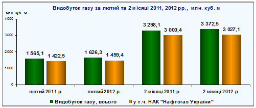 За 2 місяці 2012 року видобуток газу на 74,4 млн. куб. м (або на 2,3%) більше ніж за 2 місяці 2011 року, у тому числі обсяг видобутку газу підприємствами НАК "Нафтогаз України" більше на 26,7 млн. куб. м. (або на 0,9%).
