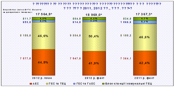 При цьому, тепловими електростанціями та теплоелектроцентралями (далі ТЕС та ТЕЦ) вироблено 9 554,0 млн. кВт∙г електроенергії, що на 1 453,8 млн. кВт∙г, або на 17,9% більше ніж за лютий 2011 року.