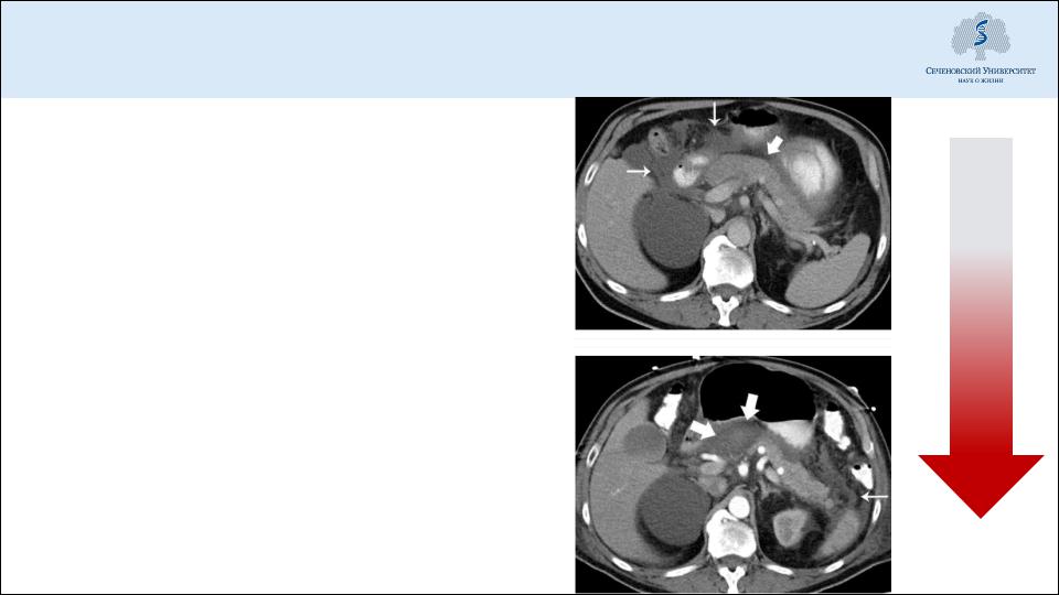 •При тяжелом остром панкреатите (панкреонекрозе) – динамическая КТ (раз в 4-7 дней) для контроля воспалительного процесса, изменений в поджелудочной железе, забрюшинной клетчатке etc.