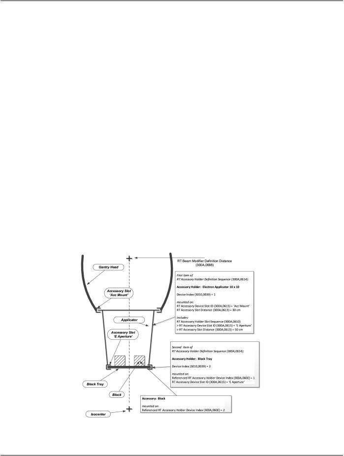 •In this example, an electron applicator is mounted in that slot. The electron applicator itself has a slot called E Aperture, where other accessories can be mounted. Therefore the electron applicator is an RT Accessory Holder, which includes a slot sequence to model that slot.
