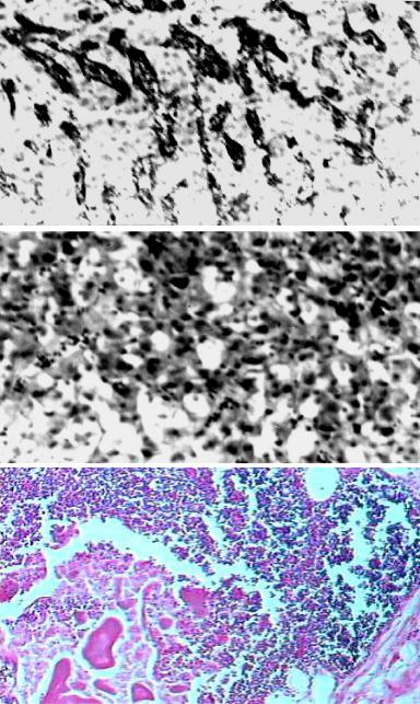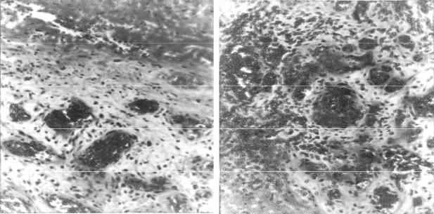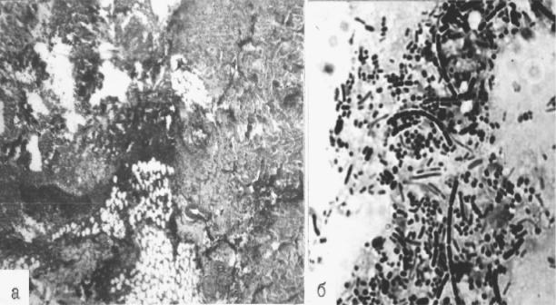 При гистологическом исследовании очагов ихорозной инфекции обнару- живают явления отека, диапедезные кровоизлияния и распространенный некроз тканей в краях раны (рис 31, а). В них обнаруживают обилие разнообразных микробов — палочек и кокков, стрептобацилл, фузобактерий, овоидов, которые