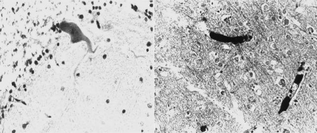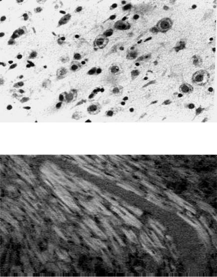 лизис нейронов в слое пирамидных клеток серо- го вещества коры голов- ного мозга (окраска гема- токсилином и эозином, × 500), рисунок Н.Д.