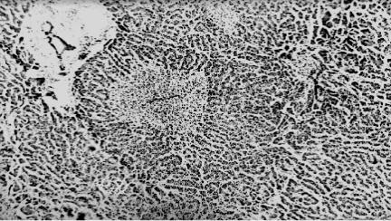 Рис. 41. Микропрепарат печени при ишемиче- ской гепатопатии: мо- ноцеллюлярные и груп- повые некрозы гепато- цитов (окраска гематок- силином и эозином, × 100), рисунок С.А.