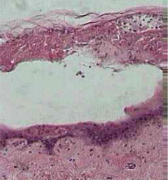 над базальным слоем эпидер- миса — полость (пузырь) (окраска гематоксилином и эо- зином, × 70)